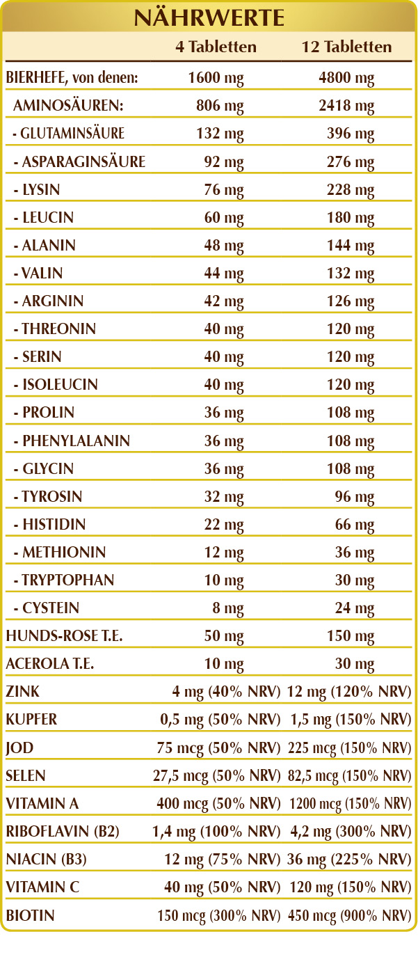 Nahrungsergänzungsmittel auf Grundlage von Bierhefe, Mineralstoffen und Vitaminen. Zink, Jod und Vitamin A, B2, B3, C und Biotin unterstützen das Wohlbefinden der Haut. Zink, Selen und Biotin unterstützt die Aufrechterhaltung des guten Zustand der Haare, während Kupfer auf die normale Pigmentierung von Haut und Haar trägt.