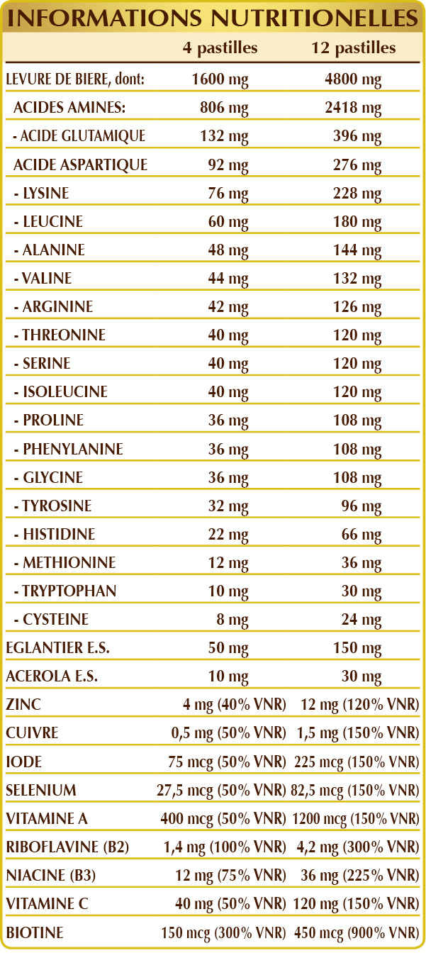 Levure de bière (Saccharomyces cerevisiae), cellulose microcristalline°, gomme arabique°, égantlier (Rosa canina) fruits E.S. (normalisé à 70% de vitamine C), dioxyde de silicium°°, gluconate de zinc, vitamine B3 (nicotinamide), acérola (Malpighia glabra) fruits E.S. (normalisé à 50% de vitamine C); arôme naturel : fenouil (Foeniculum vulgare) fruits O.E. ; stéarate de magnésium d'origine végétale°°, gluconate de cuivre, vitamine A (acétate de rétinyle), vitamine B2 (riboflavine), biotine, iodure de potassium, sélénite de sodium.