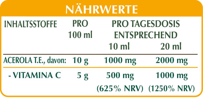 Bidestilliertes pflanzliches Glycerin, reines Wasser, Acerola (Malpighia glabra) Früchte T.E. (titriert mit 50% Vitamin C).