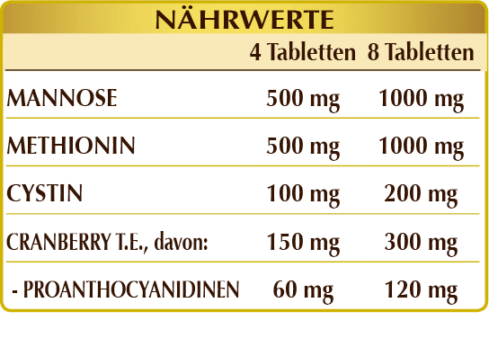 Ergänzung von Mannose, Aminosäuren (Methionin und Cystin) und Cranberry-Extrakt. Letztere, auch als amerikanische Cranberry bekannt, fördert den Abfluss von Körperflüssigkeiten und die Funktionsfähigkeit der Harnwege sowie eine wohltuende antioxidative Wirkung.