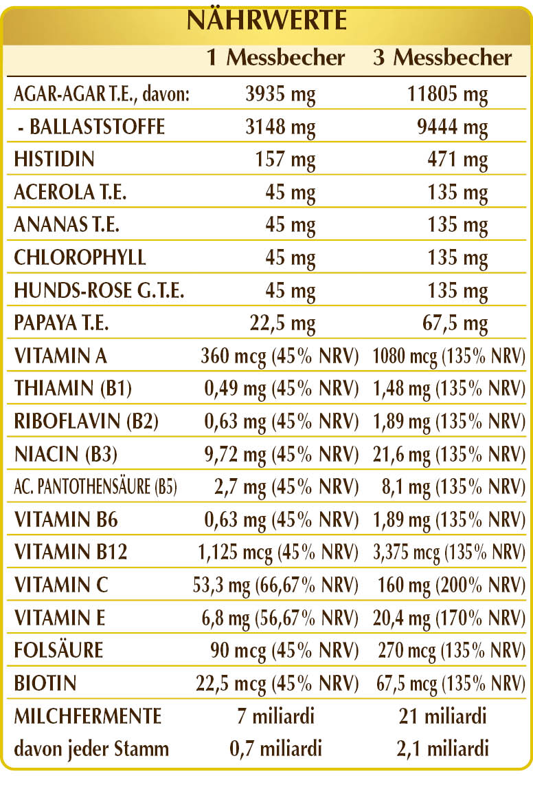 Agar ist ein löslicher Ballaststoff, der weder verdaut, noch vom Darm absorbiert wird; er normalisiert die Stuhlmenge und -konsistenz, indem er die regelmäßige Darmpassage fördert. Probiotische Milchfermente können nützlich sein, um die natürliche Darmbakterienflora wieder auszugleichen. Mit Zugabe von Chlorophyll, Vitaminen und anderen Nährstoffen. Insbesondere Vitamin B6, B12 und C helfen, Müdigkeit und Erschöpfung zu reduzieren und unterstützen, zusammen mit Vitamin A und Folsäure, die Funktion des Immunsystems.