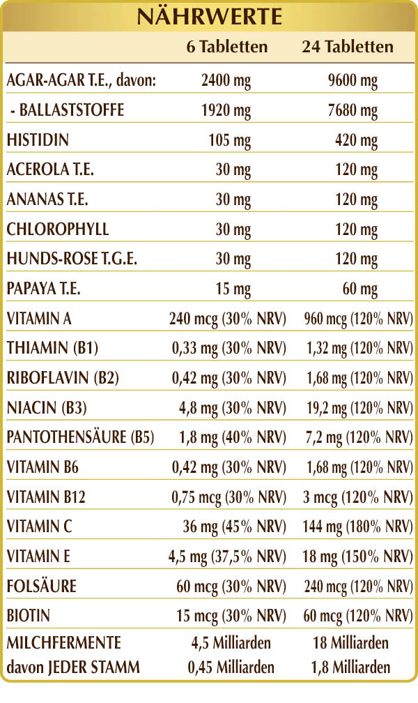 Agar ist ein löslicher Ballaststoff, der weder verdaut, noch vom Darm absorbiert wird; er normalisiert die Stuhlmenge und -konsistenz, indem er die regelmäßige Darmpassage fördert. Probiotische Milchfermente können nützlich sein, um die natürliche Darmbakterienflora wieder auszugleichen. Mit Zugabe von Chlorophyll, Vitaminen und anderen Nährstoffen. Insbesondere Vitamin B6, B12 und C helfen, Müdigkeit und Erschöpfung zu reduzieren und unterstützen, zusammen mit Vitamin A und Folsäure, die Funktion des Immunsystems.