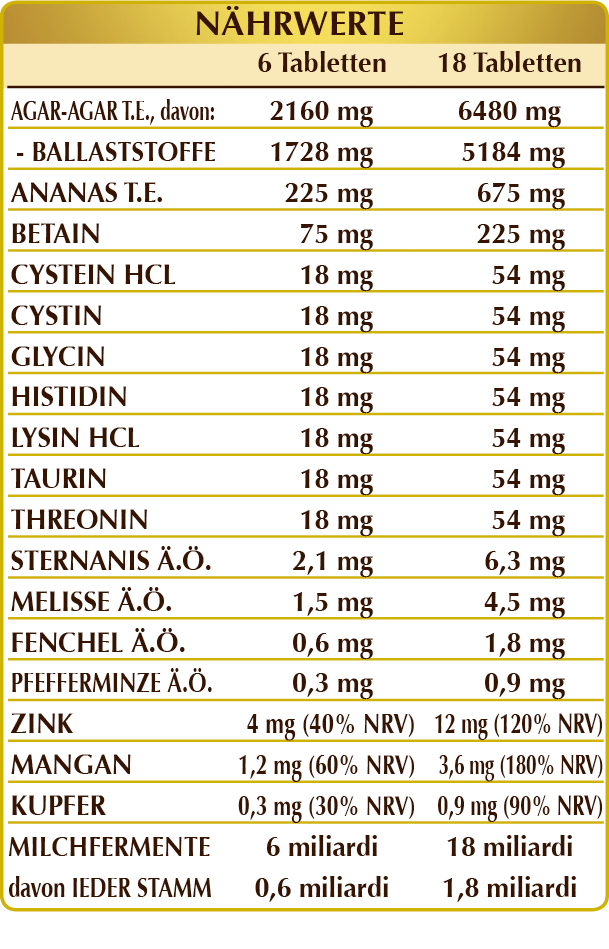 Agar (Gelidium amansii) Thallus (Alge) T.E., Ananas (Ananas comosus) Fruchtstiele T.E. (Bromelain 2500 GDU/g), mikrokristalline Cellulose°, Gummi Arabicum°, Betainchlorhydrat oder HCL, Zinkgluconat, lebende Milchfermente-Mischung (standardisiert auf 10% jeder der folgenden Stämme ATCC: Bifidobacterium bifidum SD5215, breve SD5206, lactis SD5219; Lactobacillus acidophilus SD5212, brevis SD5214, bulgaricus SD5589, casei SD5213, paracasei SD5275, plantarum SD5209, rhamnosus SD5217), Siliciumdioxid°°, Zinkgluconat, (L-)Cystein, (L-)Cystin, Glycin, (L-)Histidin, (L-)Lysin, Taurin, (L-)Threonin, Mangangluconat, Maltodextrine aus Mais oder Reis, Magnesiumstearat pflanzlichen Ursprungs°°, Kupfergluconat, Sternanis (Illicium verum) Früchte Ä.Ö., Melisse (Melissa officinalis) Blätter Ä.Ö., Fenchel (Foeniculum vulgare) Früchte Ä.Ö., Pfefferminze (Mentha piperita) Blätter Ä.Ö.