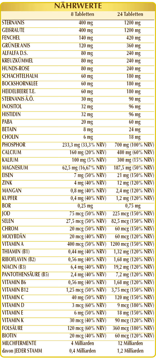 Magnesiumglycerophosphat, zweibasisches Calciumphosphat, Sternanis (Illicium verum) Fruchte Pulv, Geißraute(Galega officinalis) Kraut mit Blüten Pulv, Gummi Arabicum°, mikrokristalline Cellulose°, Kalziumglycerophosphat, dibasisches Kaliumphosphat, Fenchel (Foeniculum vulgare) Fruchte Pulv, grüner Anis (Pimpinella anisum) Fruchte, Alfalfa oder Luzerne (Medicago sativa) Kraut mit Blüten D.S., Kreuzkümmel (Cuminum cyminum) Fruchte Pulv, Hunds-Rose (Rosa canina) Fruchte T.E. (mit 50% Vitamin C titriert), Schachtelhalm oder Pferdeschwanz (Equisetum arvense) Kraut Pulv, Bockshornklee (Trigonella foenum-graecum) Samen Pulv, Heidelbeere (Vaccinium myrtillus) Früchte D.S. (standardisiert auf 25% Anthocyanosiden), Eisenammoniumcitrat, Zinkgluconat, Myo-Inositol pflanzlichen Ursprungs (aus Maiskerne extrahiert), (L-)Histidin, Sternanis (Illicium verum) Fruchte Ä.Ö., Siliciumdioxid°°, PABA (p-Aminobenzoesäure), lebende Milchfermente-Mischung (in jedem der folgenden Stämme auf 10% titriert: Bifidobacterium bifidum SD5215, breve SD5206, lactis SD5219; Lactobacillus acidophilus SD5212, brevis SD5214, bulgaricus SD5589, casei SD5213, paracasei SD5275, plantarum SD5209, rhamnosus SD5217), Magnesiumstearat pflanzlichen Ursprungs°°, Cholintartrat, Vitamin E pflanzlichen Ursprungs (D-α-Tocopherylacetat), Magnesiumoxid, Betain, Mangangluconat, Vitamin B3 (Nicotinamid), Kupfergluconat, Vitamin A (Retinylacetat), Vitamin B5 (Calciumpantothenat), Natriumborat, Flechte (Cladonia rangiferina), Thallus T.E. (standardisiert auf Vitamin D3 Cholecalciferol 100.000 IE/g), aktiviertes Vitamin B2 (Riboflavin-5-phosphat-Natrium), aktiviertes Vitamin B6 (Pyridoxal-5-phosphat), Vitamin B1 (Thiamin-Hydrochlorid), Chrompicolinat, aktivierte Folsäure (L-Methylfolat-Calcium), Kaliumiodid, Natriumselenit, Natriummolybdat, Vitamin K1 (Phyllochinon), Biotin, aktiviertes Vitamin B12 (5-Desoxyadenosylcobalamin, Methylcobalamin).