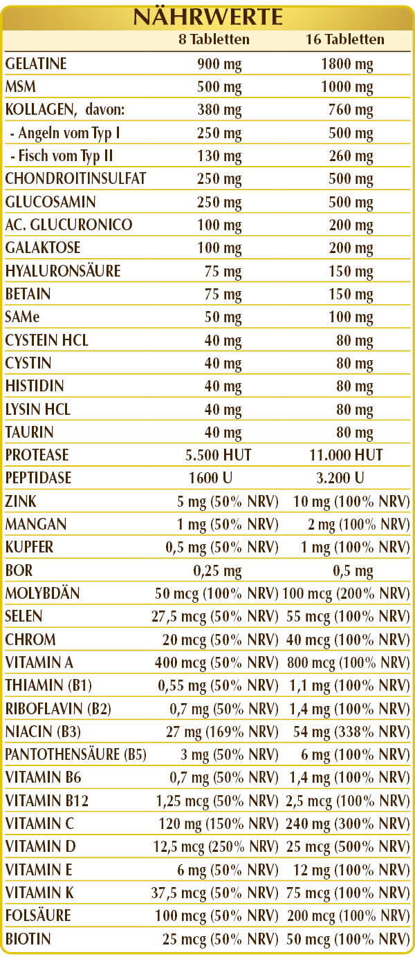 Gelatine (aus Rinderhaut), MSM (Methylsulfonylmethan), D-Glucosaminsulfat (aus Fermentation), Chondroitinsulfat (aus Rind), Kollagen Typ I aus hydrolysiertem Fischgelatinegranulat, Kollagen Typ II aus hydrolysierter Hühnerknorpelpulver (zu 52 %), mikrokristalline Cellulose°, Gummi arabicum°, Vitamin C (Ascorbinsäure), Natriumglucuronat, (D-)Galaktose pflanzlichen Ursprungs, SAMe (S-Adenosylmethionin-Disulfat-Tosilat), Siliciumdioxid°°, Betain, Natriumhyaluronat, Zinkgluconat, (L-)Cystein-HCL, (L-)Cystin, (L-)Histidin, (L-)Lysin-HCL, Taurin, pflanzliches Magnesiumstearat°°, Vitamin B3 (Inositolhexanicotinat), pflanzliches Vitamin E (D-α-Tocopherylacetat), Protease (500.000 HUT/g), Mangan-Gluconat, Peptidase (200.000 U/g), Flechte (Cladonia rangiferina) Thallus T.E. (titriert mit 50% in Vitamin D3 Cholecalciferol 100.000 IE/g), Kupfergluconat, Vitamin B5 (Calciumpantothenat), Vitamin A (Retinylacetat), Natriumborat, aktiviertes Vitamin B2 (Riboflavin-5-phosphat-Natrium), aktiviertes Vitamin B6 (Pyridoxal-5-phosphat), Vitamin B1 (Thiamin-Hydrochlorid), Chrompicolinat, Natriummolybdat, aktivierte Folsäure (L-Methylfolat-Calcium), Natriumselenit, Vitamin K1 (Phyllochinon), Biotin, aktiviertes Vitamin B12 (5-Desoxyadenosylcobalamin, Methylcobalamin). T.E.= Trockenextrakt °Füllstoff °°Trennmittel