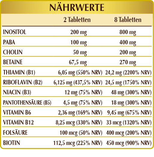 Nahrungsergänzungsmittel, das alle Vitamine der B-Gruppe enthält. Insbesondere die Vitamine B6 und B12 fördern die normale Bildung von roten Blutkörperchen und, zusammen mit den Vitaminen B2, B3, B5 und Folsäure, reduzieren sie Müdigkeit und Erschöpfung. Die Vitamine B1, B3, B6, B12 und Biotin unterstützen die Funktionalität des Nervensystems, und in Zusammenarbeit mit Folsäure sind sie nützlich, um die normale psychologische Funktion aufrechtzuerhalten. Die Vitamine B6, B12 und Folsäure sind auch für die normale Funktion des Immunsystems unentbehrlich.