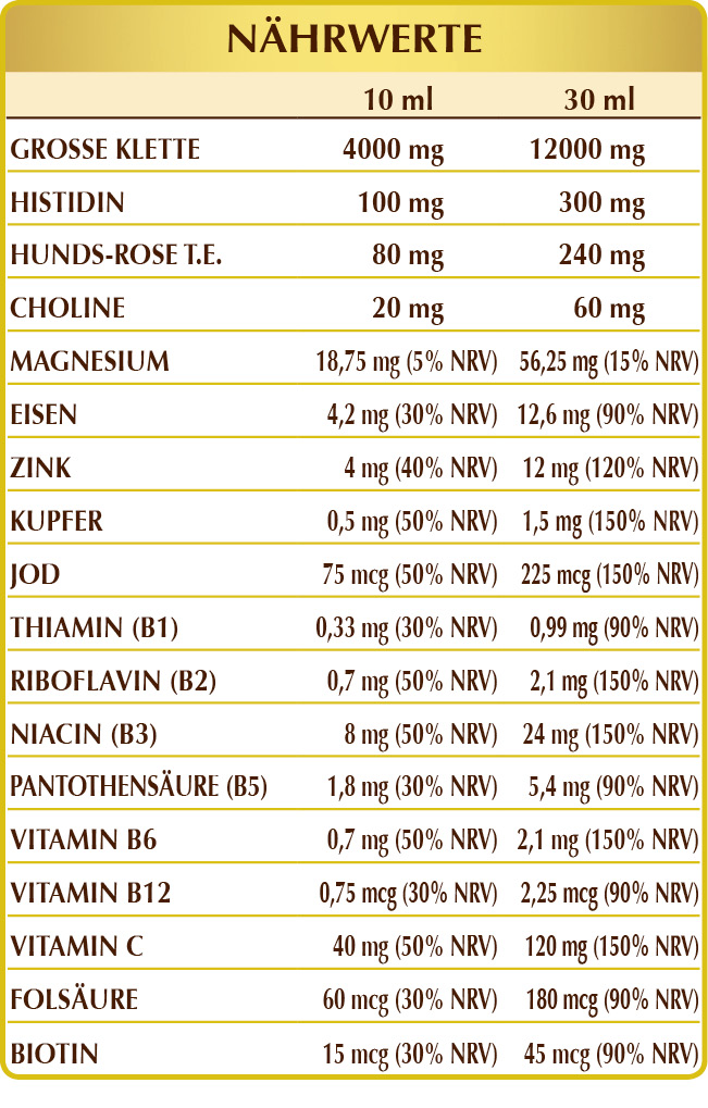 Reines Wasser, Klette (Arctium lappa) Gras und frische Wurzeln F.G.E., pflanzliches Glycerin destilliert, Magnesiumglycerophosphat, (L-)Histidin, Hundsrose (Rosa canina) Früchte T.G.E. (titriert mit 50% Vitamin C), Zinkgluconat, Eisenammoniumcitrat, Cholin-HCL oder Hydrochlorid, Vitamin B3 (Nicotinamid); natürliche Süßstoffe: Steviolglykoside aus Stevia, Thaumatin; Kupfersulfat, Vitamin B5 (Calciumpantothenat), aktiviertes Vitamin B2 (Riboflavin-5-Phosphat-Natrium), aktiviertes Vitamin B6 (Pyridoxal-5-Phosphat), Vitamin B1 (Thiamin), Kaliumjodid, aktivierte Folsäure (L-Methylfolat-Calcium), Biotin, aktiviertes Vitamin B12 (5-Desoxyadenosylcobalamin, Methylcobalamin).