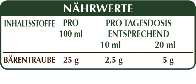 Alkoholfreie Flüssig Gesamt-Extrakt, gewonnen aus: bidestilliertes pflanzliches Glycerin, reinem Wasser, Bärentraube (Arctostaphylos uva-ursi) Blätter.