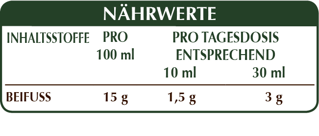 Alkoholfreie Flüssig Gesamt-Extrakt, gewonnen aus: bidestilliertes pflanzliches Glycerin, reinem Wasser, Beifuß (Artemisia vulgaris) Kraut mit Blüten.