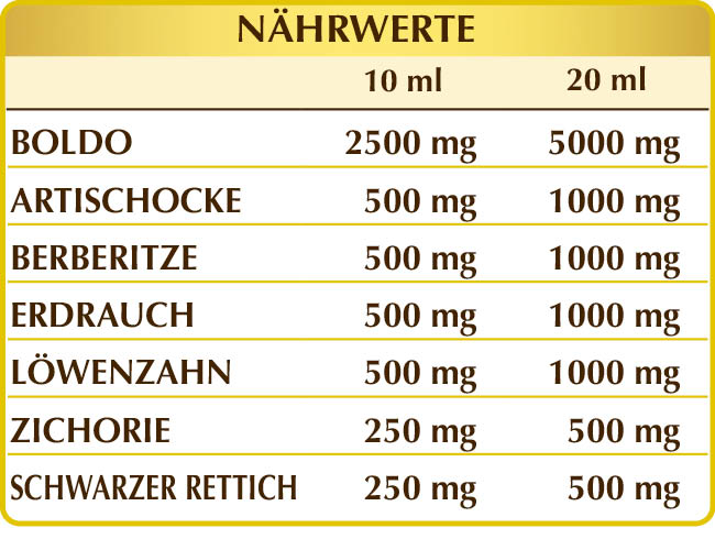 Bidestilliertes pflanzliches Glycerin, reines Wasser, Boldo (Peumus boldus) Blätter F.G.E., Artischocke (Cynara scolymus) Blätter F.G.E., Berberitze (Berberis vulgaris) Wurzelrinde F.G.E., Erdrauch (Fumaria officinalis) Kraut mit Blüten F.G.E., Löwenzahn (Taraxacum officinale) Wurzeln F.G.E., Zichorie (Cichorium intybus) Wurzeln F.G.E., Schwarzer Rettich (Raphanus sativus var. niger) Wurzeln F.G.E.