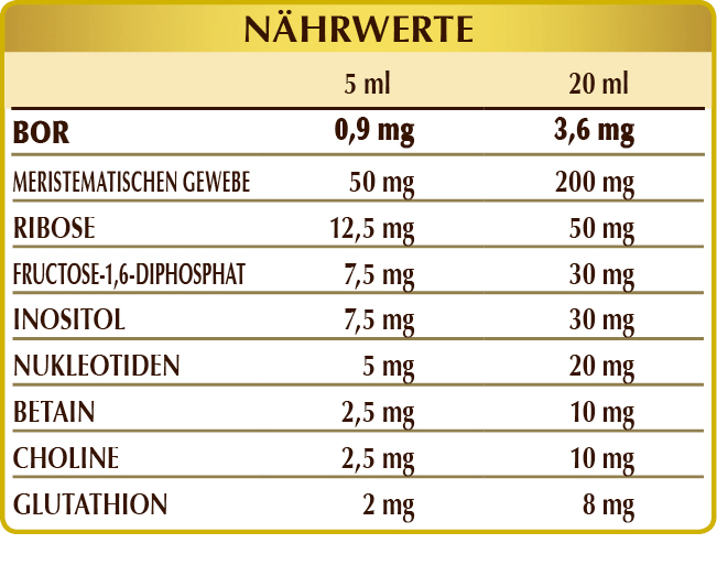 Bidestilliertes pflanzliches Glycerin, reines Wasser; frische meristematische Gewebe: Wacholder (Juniperus communis) junge Triebe, Bergkiefer (Pinus montana, Synonyme Pinus mugo oder Pinus pumilio) Knospen, Jungfernrebe (Ampelopsis veitchii, Synonym Parthenocissus tricuspidata) junge Triebe; Ribose, Fructose-1,6-diphosphat; Säureregulator: Zitronensäure; Natriumborat, Inositol, Betaincitrat, Cholintartrat; Nukleotid-Mischung: AMP (Adenosinmonophosphat), CMP (Cytosinmonophosphat), GMP (Guanosinmonophosphat), UMP (Uridinmonophosphat); Glutathion, Süßstoffe natürlicher Herkunft: Thaumatin. Mit natürlichen Süßungsmitteln.