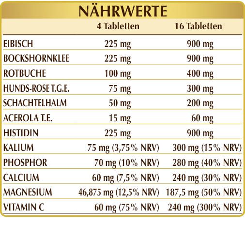 Dibasisches Kalziumphosphat, Eibisch (Althea officinalis) Wurzeln Pulv, Bockshornklee (Trigonella foenum-graecum) Samen Pulv, (L-)Histidin, mikrokristalline Cellulose°, Gummi Arabicum°, Magnesiumcarbonat, dibasisches Kaliumphosphat, Rotbuche (Fagus sylvatica) Teer oder Pech (Pix), Hunds-Rose (Rosa canina) Früchte T.E. (titriert mit 70% Vitamin C), Siliciumdioxid°°, Schachtelhalm oder Pferdeschwanz (Equisetum arvense) Kraut Pulv, Acerola (Malpighia glabra) Früchte T.E. (titriert mit 50% Vitamin C), Magnesiumstearat Pflanzlichen Ursprungs°°. Pulv. = Pulver °Füllstoff °°Trennmittel