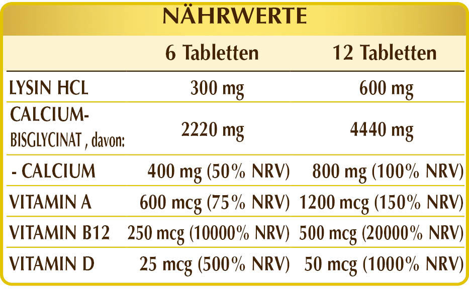 Calcium-Bisglycinat, (L-)Lysin HCL oder Hydrochlorid, Gummi arabicum°, mikrokristalline Cellulose°, pflanzliches Magnesiumstearat°°, Flechte (Cladonia rangiferina) Thallus T.E. (standardisiert auf Vitamin D3 Cholecalciferol 100.000 IE/g), Vitamin A (Retinylacetat 500.000 IE/g), aktiviertes Vitamin B12 (5-Deoxyadenosylcobalamin, Methylcobalamin).