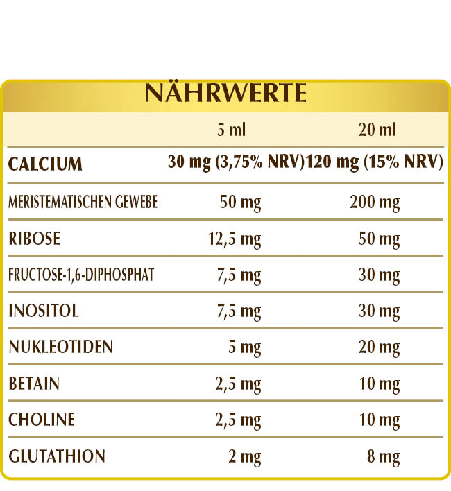 Bidestilliertes Pflanzliches Glycerin, reines Wasser, Kalziumlaktat; Frisches Meristemgewebe (1%): Weiß-Tanne (Abies pectinata, Synonym Abies alba) Knospen, Hunds-Rose (Rosa canina) Junge Triebe, Silber-Linde (Tilia tomentosa) Knospen, Weinrebe (Vitis vinifera) Knospen; Ribose, Fructose-1,6-diphosphat; Acidität Korrektor: Milchsäure; Inositol, Betaincitrat, Cholintartrat; Nukleotid-Mischung: AMP (Adenosinmonophosphat), CMP (Cytosinmonophosphat), GMP (Guanosinmonophosphat), UMP (Uridinmonophosphat); Glutathion, Süßstoffe natürlicher Herkunft: Thaumatin.