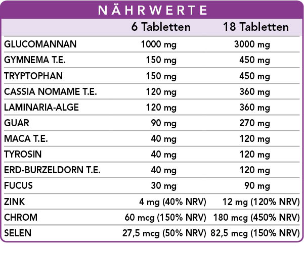 Glucomannan trägt zum Gewichtsverlust bei,* während Guar das Sättigungsgefühl begünstigt sowie die Absorption der Nährstoffe. Gymnema helft dabei das Hungergefühl zu kontrollieren während Laminaria und Fucus den Stoffwechsel stimulieren. Cassia Nomame hilft beim Cholesterin- und Triglyceridstoffwechsel, während Gymnema den Kohlenhydratstoffwechsel unterstützt und zusammen mit Fucus, in den Fettstoffwechsel eingreift. Cassia Nomame und Fucus halten das Gleichgewicht des Körpergewichts während Maca und Erd-Burzeldorn eine tonische Wirkung ausüben, nützlich um körperlicher und geistiger Müdigkeit entgegen zu wirken. Selen fördert die Spermatogenese, während Zink dazu beiträgt, den normalen Testosteronspiegel im Blut aufrechtzuerhalten und die Fortpflanzung und männliche Fruchtbarkeit zu unterstützen.