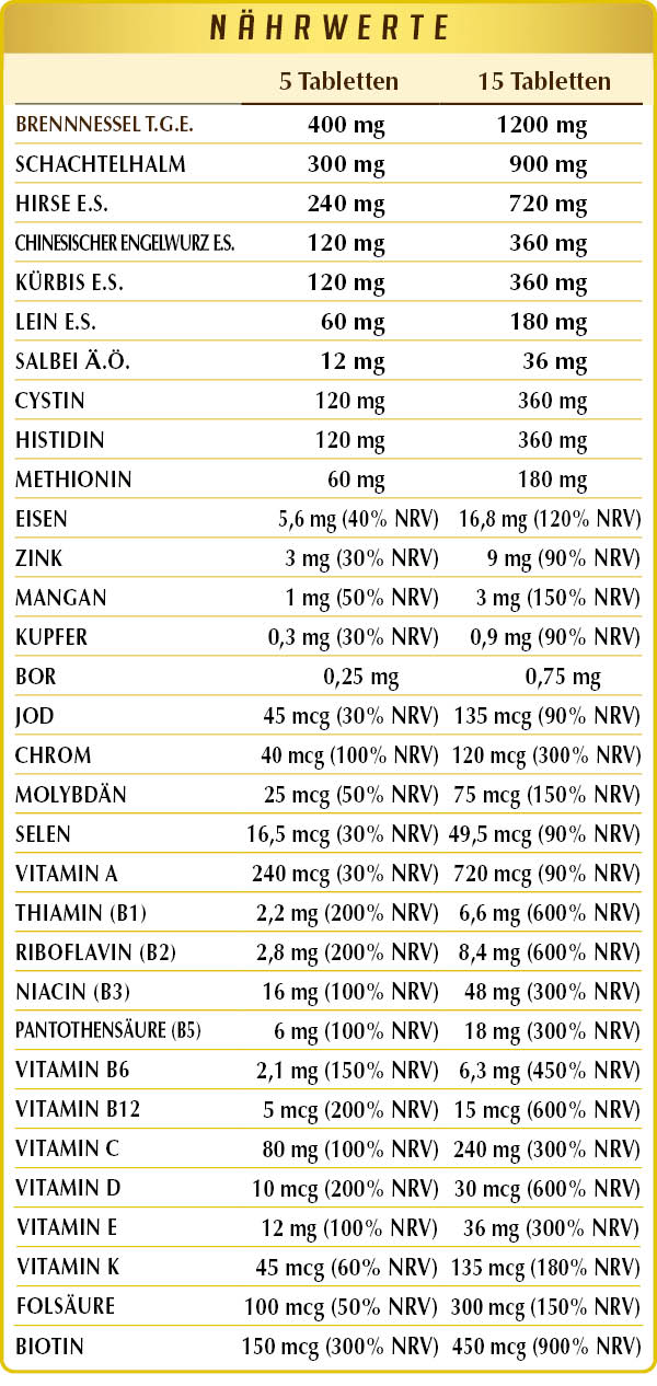 Brennnessel (Urtica dioica) Wurzeln und Blätter T.G.E., mikrokristalline Zellulose°, Gummi arabicum °, Schachtelhalm oder Pferdeschwanz (Equisetum arvense) Kraut Pulver, Hirse (Panicum miliaceum) Früchte T.E., chinesischer Engelwurz (Angelica sinensis) Wurzeln T.E. (titriert mit 1 % Ligustilden), (L-)Cystin, (L-)Histidin, Kürbis (Cucurbita pepo var. oleifera) Samen T.E. (titriert mit 40 % Fettsäuren und mit 0,075 % Beta-Sitosterolen), Vitamin C (Ascorbinsäure), Leinen(Linum usitatissimum) Samen T.E. (titriert mit 20 % in Secoisolariciresinol-Diglucosid), (L-)Methionin, Siliciumdioxid°°, Eisen-Gluconat, Vitamin E pflanzlichen Ursprungs (D-α-Tocopherylacetat), Zink-Gluconat, Vitamin B3 (Nicotinamid), Magnesiumstearat pflanzlichen Ursprungs°°, Salbei (Salvia officinalis) Blätter Ä.Ö. Mangan-Gluconat, Vitamin B5 (Calciumpantothenat), Natriumborat, aktiviertes Vitamin B2 (Riboflavin-5-Phosphat-Natrium), Flechte (Cladonia rangiferina) Thallus T.E. (titriert mit Vitamin D3 Cholecalciferol 100.000 IE/g), aktiviertes Vitamin B6 (Pyridoxal-5-phosphat), Vitamin B1 (Thiaminhydrochlorid), Kupfergluconat, Vitamin A (Retinylacetat), Chrompicolinat, Biotin, aktivierte Folsäure (Calcium-L-methylfolat), Natriummolybdat, Kaliumiodid, Vitamin K1 (Phyllochinon), Natriumselenit, aktiviertes Vitamin B12 (5-Desoxyadenosylcobalamin, Methicobalamin).