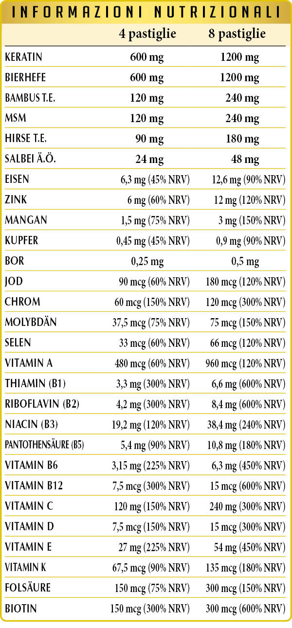 Hydrolysiertes Keratin, Bierhefe (Saccharomyces cerevisiae), mikrokristalline Cellulose°, Gummi arabicum°, Bambus (Bambusa vulgaris) Junge Stämme T.E. (standardisiert mit 70% Weide), MSM (Methylsulfonylmethan), Vitamin C (Ascorbinsäure), Hirse (Panicum miliaceum) Früchte T.E., Vitamin E pflanzlichen Ursprungs (D-α-Tocopherylacetat), Eisengluconat, Zinkgluconat, Silicium Dioxid°°, Salbei (Salvia officinalis) Blätter Ä.Ö., Vitamin B3 (Nikotinamid), Mangangluconat, Magnesiumstearat pflanzlichen Ursprungs°°, Natriumborat, aktivierte Vitamin B2 (Natriumriboflavin-5-phosphat), Vitamin B5 (Calciumpantothenat), aktiviertes Vitamin B6 (Pyridoxal-5-phosphat), Vitamin B1 (Thiaminhydrochlorid), Kupfergluconat, Vitamin A (Retinylacetat), Flechte Cladonia rangiferina Thallus D.E. (standardisiert mit Vitamin D3 Cholecalciferol 100.000 IE/g), Chrompicolinat, aktivierte Folsäure (Calcium-L-Methylfolat), Biotin, Kaliumjodid, Natriummolybdat, Natriumselenit, Vitamin K1 (Phyllochinon), aktiviertes Vitamin B12 (5-Desoxyadenosylcobalamin, Methylcobalamin). °Füllstoff °°Trennmittel