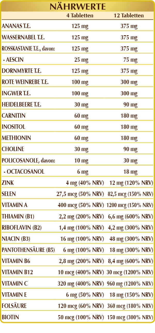 Vitamin C (Ascorbinsäure), mikrokristalline Cellulose°, Gummi Arabicum°, Ananas (Ananas sativus) Fruchtstiele T.E. (Bromelain 2500 GDU / g), Wassernabel (Centella asiatica) Kraut T.E. (titriert mit 20% gesamte Triterpenderivate), Rosskastanie (Aesculus hippocastanum Samen T.E. (titriert mit 20% Aescin), Dornmyrte oder Mäusedorn (Ruscus aculeatus) Wurzeln T.E. (titriert mit 5% Ruscogenin), dibasisches Kalziumphosphat, Ingwer (Zingiber officinalis) Rhizome T.E. (titriert mit 5% in Gingerole), Acetyl-(L)-Carnitin HCL oder Hydrochlorid, Cholintartrat, Myo-Inositol Natürlicher Herkunft (extrahiert aus Maissamen), (L-)Methionin, Roten Weinrebe (Vitis vinifera) Blätter T.E. (titriert mit 5% Polyphenolen), Siliciumdioxid°°, Rote Weinrebe (Vitis vinifera) Samen T.E. (titriert mit 95% oligomeren Proanthocyanidinen), Heidelbeere (Vaccinium myrtillus), Zinkgluconat, Früchte T.E. (titriert mit 25 % in Anthocyanosiden titriert), Vitamin B3 (Inositolhexanicotinat), Vitamin E pflanzlichen Ursprungs (D-α-Tocopherylacetat), Magnesiumstearat pflanzlichen Ursprungs°°, Policosanole aus Zuckerrohr (Extrakt mit 60 % Octacosanol titriert), Vitamin B5 (Calciumpantothenat), aktiviertes Vitamin B6 (Pyridoxal-5-phosphat), Vitamin B1 (Thiaminhydrochlorid), Vitamin A (Retinylacetat), aktiviertes Vitamin B2 (Riboflavin-5-Natriumphosphat), aktivierte Folsäure (Calcium-L-methylfolat) , Natriumselenit, Biotin, aktiviertes Vitamin B12 (5-Desoxyadenosylcobalamin, Methicobalamin). °Füllstoff °°Trennmittel
