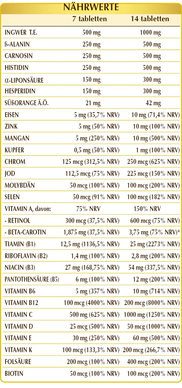 Ingwer (Zingiber officinalis) Rhizome T.E. (standardisiert auf 5 % Gingerole), Vitamin C (Ascorbinsäure), mikrokristalline Cellulose°, Gummi arabicum°, ß-Alanin, (L-)Carnosin, (L-)Histidin, R-α-Lipoinsäure, Citrus-Hesperidin, Siliciumdioxid°°, Vitamin E pflanzlichen Ursprungs (D-α-Tocopherylacetat), Eisen-Gluconat, Mangan-Gluconat, Zink-Gluconat, Vitamin B3 (Niacinamid); natürliches Aroma: süße Orange (Citrus aurantium var. sinensis oder dulcis) Fruchtschalen-Öl; Dunaliella (Dunaliella salina) Thallus (Alge) T.E. (standardisiert auf 10 % Beta-Carotin), Vitamin B1 (Thiamin-Hydrochlorid), Magnesiumstearat pflanzlichen Ursprungs°°, Flechte (Cladonia rangiferina) Thallus E.S. (standardisiert auf Vitamin D3 (Colecalciferol) 100.000 IE/g), aktiviertes Vitamin B6 (Pyridoxal-5-Phosphat), Vitamin B5 (Calciumpantothenat), Kupfer-Gluconat, aktiviertes Vitamin B2 (Riboflavin-5-Phosphat-Natrium), Vitamin A (Retinylacetat), Chrom-Picolinat, aktiviertes Folsäure (L-Methylfolat-Calcium), Kaliumiodid, Natriummolybdat, Natriumselenit, aktiviertes Vitamin B12 (5-Deoxyadenosylcobalamin, Methylcobalamin), Vitamin K1 (Phyllochinon), Biotin. °Füllstoff °°Trennmittel