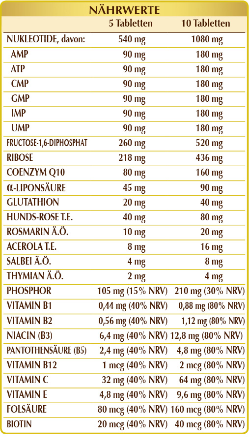 Nukleotid-Mischung: AMP (Adenosinmonophosphat), ATP (Adenosintriphosphat), CMP (Cytosinmonophosphat), GMP (Guanosinmonophosphat), IMP (Inosinmonophosphat), UMP (Uridinmonophosphat); Fructose 1,6-Diphosphat, mikrokristalline Cellulose°, Gummi arabicum°, Ribose, Coenzym Q10, α-Liponsäure, Hunderose (Rosa canina) Früchte T.E.(mit 70% Vitamin C titriert), Glutathion, Siliziumdioxid°°, Magnesiumstearat pflanzlichen Ursprungs°°, Vitamin E pflanzlichen Ursprungs (D-α-Tocopherylacetat), Rosmarin (Rosmarinus officinalis), blühende Spitzen Ä.Ö., Sorbitol, Acerola (Malpighia glabra) Früchte T.E., (mit 50% Vitamin C titriert), Vitamin B3 (Nikotinamid), Salbei (Salvia officinalis) hinterlässt Ä.Ö., Vitamin B5 (Calciumpantothenat), echter Thymian (Thymus vulgaris) Blätter Ä.Ö., Vitamin B2 (Riboflavin), Vitamin B6 (Pyridoxinhydrochlorid), Vitamin B1 (Thiaminhydrochlorid), Folsäure, Biotin, Vitamin B12 (Cyanocobalamin).