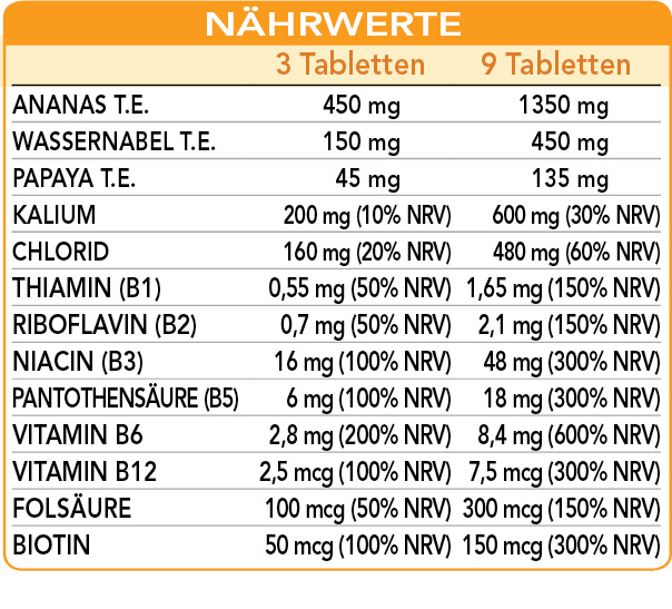 Ananas und Wassernabel sind nützlich, um den Unschönheiten der Cellulite entgegen zu wirken. Außerdem fördert Ananas die Drainage der Körperflüssigkeiten und fördert, zusammen mit Wassernabel, die Funktionalität der Mikrozirkulation und lindert das Schweregefühl der Beine. Vitamin B1, B3, B5, B6, B12 und Biotin tragen zum normalen Energiestoffwechsel bei.