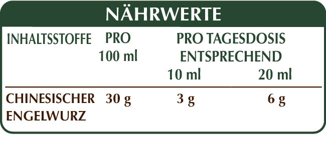 Alkoholfreie Flüssig Gesamt-Extrakt, gewonnen aus: bidestilliertes pflanzliches Glycerin, reinem Wasser, Wald-Engelwurz (Angelica sinensis) Wurzeln.