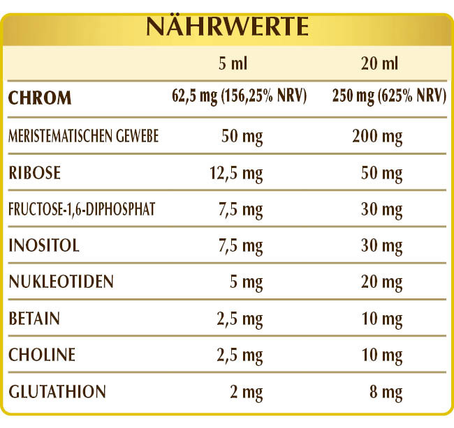 Chrom unterstützt den normalen Stoffwechsel von Makronährstoffen (Kohlenhydrate und Fette) und trägt zur Aufrechterhaltung normaler Blutzuckerspiegel bei.