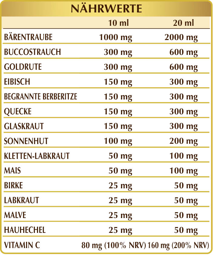 Bidestilliertes pflanzliches Glycerin, reines Wasser, Bärentraube (Arctostaphylos uva-ursi) Blätter F.G.E., Buccostrauch (Barosma betulina) Blätter F.G.E., Goldrute (Solidago virga-aurea) Kraut mit Blüten, Eibisch (Althaea officinalis) Wurzeln F.G.E., Berberitze (Berberis vulgaris) Wurzelrinde F.G.E., Quecke (Agropyron repens) Rhizome F.G.E., Glaskraut (Parietaria officinalis) Kraut F.G.E., Kaliumascorbat, Sonnenhut (Echinacea angustifolia, pallida und purpurea) Wurzeln F.G.E., Kaliumbicarbonat, Kletten-Labkraut (Galium aparine) Kraut mit Blüten F.G.E., Mais oder Zuckerkorn (Zea mays) Stigmata F.G.E., Birke (Betula alba oder pubescens) Blätter F.G.E., Labkraut (Galium verum) Kraut mit Blüten F.G.E., Malve (Malva sylvestris) Blätter F.G.E., Hauhechel (Ononis spinosa) Wurzeln F.G.E.; süßstoffe natürlicher Herkunft: Steviol-Glykoside(E960) und Thaumatin (E957).
