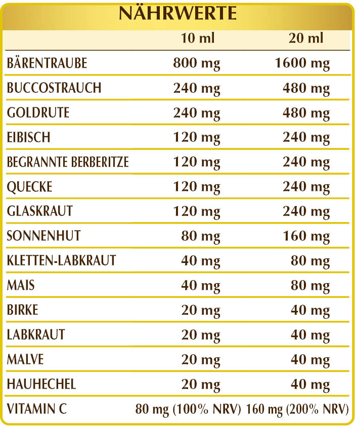 Bärentraube, Buccostrauch, Goldrute, Berberitze, Quecke, Glaskraut, Kletten-Labkraut, Mais, Birke und Labkraut fördern die Drainage der Körperflüssigkeiten und die Funktionalität der Harnwege. Des Weiteren haben Eibisch, Malve und Hauhechel eine beruhigende und lindernde Wirkung auf die Harnwege, während Sonnenhut und Vitamin C die natürlichen Abwehrkräfte des Körpers unterstützen.