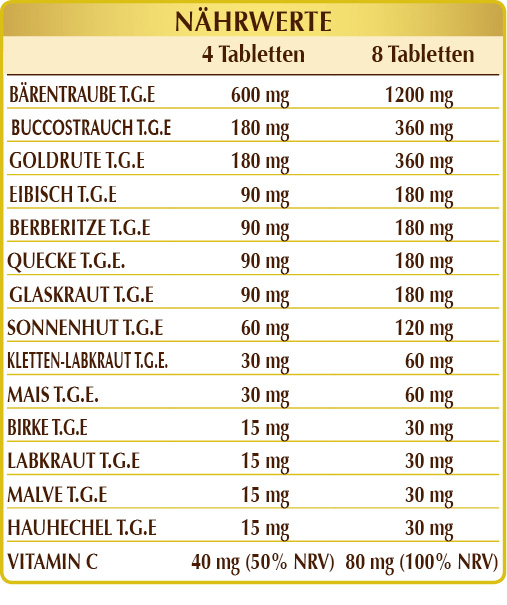 Bärentraube (Arctostaphylos uva-ursi) Blätter T.G.E., Buccostrauch (Barosma betulina) Blätter T.G.E., Goldrute (Solidago virga-aurea) Kraut mit Blüten T.G.E., mikrokristalline Cellulose°, Gummi Arabicum°, Eibisch (Althaea officinalis) Wurzeln T.G.E., Berberitze (Berberis vulgaris) Wurzelrinde T.G.E., gramigna (Agropyron repens) Rhizome T.G.E., Glaskraut (Parietaria officinalis) Kraut T.G.E., Sonnenhut (Echinacea angustifolia, pallida und purpurea) Wurzeln T.G.E., Kaliumascorbat, Kaliumbicarbonat, Kletten-Labkraut (Galium aparine) Kraut mit Blüten T.G.E., Mais oder Zuckerkorn (Zea mays) Stigmata T.G.E., Siliciumdioxid°°, Birke (Betula alba oder pubescens) Blätter T.G.E., Labkraut (Galium verum) Kraut mit Blüten T.G.E., Malve (Malva sylvestris) Blätter T.G.E., Hauhechel (Ononis spinosa) Wurzeln T.G.E., Magnesiumstearat pflanzlichen Ursprungs°°.