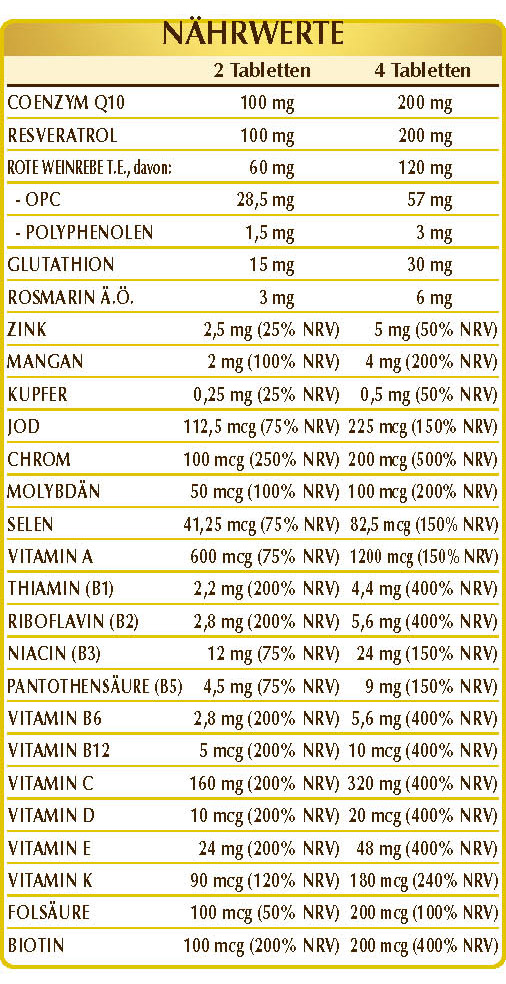 Zweibasisches Calciumphosphat, Vitamin C (Ascorbinsäure), mikrokristalline Cellulose°, Gummi arabicum°, Coenzym Q10, Resveratrol pflanzlichen Ursprungs, Vitamin E pflanzlichen Ursprungs (D-α-Tocopherylacetat), Roten Weinrebe (Vitis vinifera) Blätter T.E. (standardisiert auf 5 % in Polyphenolen), Roter Weinrebe (Vitis vinifera) Kerne T.E. (standardisiert auf 5 % oligomeren Proanthocyanidinen oder OPC), Zinkgluconat, Siliziumdioxid°°, Mangangluconat, reduziertes Glutathion, Vitamin B3 (Nikotinamid), Vitamin B5 (Calciumpantothenat), Aktivierte Vitamin B2 (Natrium-Riboflavin-5-phosphat), Magnesiumstearat pflanzlichen Ursprungs°°, Aktivierte Vitamin B6 (Pyridoxal-5-phosphat), Flechten (Cladonia rangiferina) Thallus T.E. (standardisiert auf Vitamin D3 Cholecalciferol 100.000 IE/g), Vitamin B6 (Pyridoxinhydrochlorid), Rosmarin (Rosmarinus officinalis) Blütenspitzen Ä.Ö., Vitamin B1 (Thiaminhydrochlorid), Vitamin B2 (Riboflavin), Kupfergluconat, Chrompicolinat, Kaliumjodid, Natriummolybdat, Folsäure, Biotin, Natriumselenit, Vitamin K1 (Phyllochinon), Vitamin B12 (Cyanocobalamin). °Füllstoff °°Trennmittel