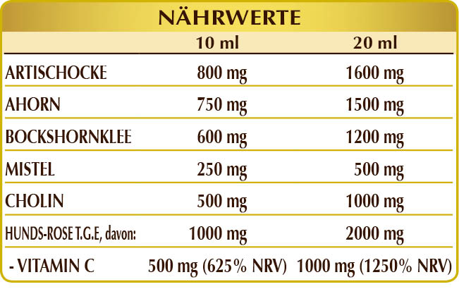 Bidestilliertes pflanzliches Glycerin, reines Wasser, Cholintartrat, Hunds-Rose (Rosa canina) Früchte F.G.E. (mit 50 % Vitamin C titriert), Artischocke (Cynara scolymus) Blätter T.G.E., Ahorn (Acer campestris) Glycerinmazerat frischer Knospen, Bockshornklee (Trigonella foenum-graecum) Samen T.G.E., Mistel (Viscum album) Blätter und Zweige T.G.E.; Süßungsmittel natürlichen Ursprungs: Steviolglycoside und Thaumatin.