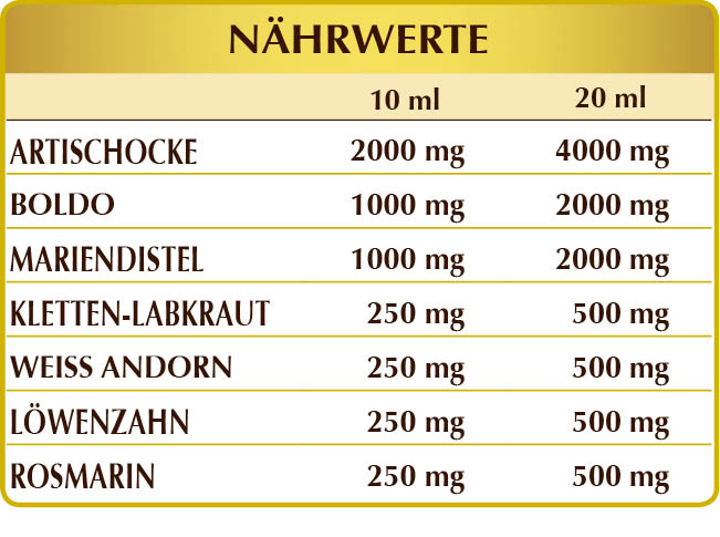 Bidestilliertes pflanzliches Glycerin, reines Wasser, Artischocke (Cynara scolymus) Blätter F.G.E., Boldo (Peumus boldus) Blätter F.G.E., Mariendistel (Silybum marianum) Früchte F.G.E., Weißer Andorn (Marrubium vulgare) Kraut mit Blüten F.G.E., Löwenzahn (Taraxacum officinale) Wurzeln F.G.E., Kletten-Labkraut (Galium aparine) Kraut mit Blüten F.G.E., Rosmarin (Rosmarinus officinalis) Blätter F.G.E.
