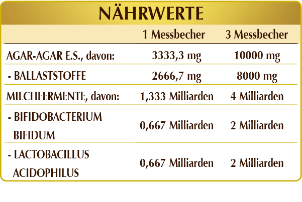 Agar-Agar ist ein löslicher Faser, die durch den Darm nicht verdaut oder absorbiert wird; es hilft, durch die Förderung der Regelmäßigkeit der Darmfunktion und die Normalisierung der Lautstärke und Konsistenz der Stühle sauber in den Darm zu halten. Probiotische Milchfermente können nützlich sein, um die natürliche Darmbakterienflora wieder auszugleichen.