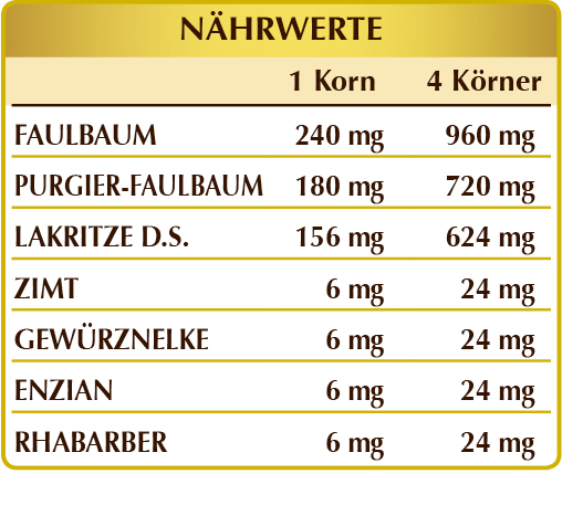 Faulbaum (Rhamnus frangula) Rinde Pulv, Purgier-Faulbaum (Rhamnus purshiana) Rinde Pulv, Lakritze (Glycyrrhiza glabra) Wurzeln D.S. (titriert mit 3-4% Glycyrrhizinsäure oder Glycyrrhizin), Zimt (Cinnamomum zeylanicum) Rinde Pulv, Gewürznelke (Eugenia caryophyllata) Blütenknospen Pulv, Enzian (Gentiana lutea) Wurzeln Pulv, Chinesischer Rhabarber (Rheum palmatum) Rhizome Pulv.