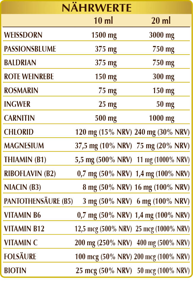 Bidestilliertes Pflanzliches Glycerin, reines Wasser, Weißdorn (Crataegus oxyacantha) Blüten, Blätter und Früchte F.G.E., (L-)Carnitin, Passionsblume (Passiflora incarnata) Kraut mit Blüten F.G.E., Baldrian (Valeriana officinalis) Wurzeln F.G.E., Magnesiumchlorid, Vitamin C (Natriumascorbat), Roten Weinrebe (Vitis vinifera) Blätter F.G.E., Rosmarin (Rosmarinus officinalis) Blätter F.G.E., Ingwer (Zingiber officinalis) Rhizome F.G.E., Vitamin B3 (Nicotinamide); Süßstoffe Natürlicher Herkunft: Steviol-Glykoside (E960) und Thaumatin (E957); Vitamin B1 (Thiaminhydrochlorid), Vitamin B5 (Calciumpantothenat), Vitamin B6 (Pyridoxinhydrochlorid), Vitamin B2 (Riboflavin), Folsäure, Biotin, Vitamin B12 (Cyanocobalamin).
