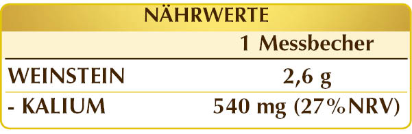 Der Weinstein (oder Kaliumbitartrat) ist ein natürliches Treibmittel, das als Ersatz für chemische Hefe für leichte und verdauliche Zubereitungen verwendet wird. Besonders geeignet für Hefeunverträglichkeiten oder zur Zubereitung von veganen und vegetarischen Desserts. Es kann in Wasser aufgelöst werden, um ein erfrischendes und muntermachendes Getränk zu erhalten.