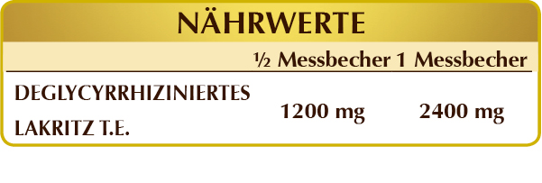 Trockenextrakt Deglycyrrhizinat aus Süßholzwurzeln (Glycyrrhiza glabra) (titriert mit 3 % Glycyrrhizinsäure oder Glycyrrhizin), Maltodextrine aus Mais oder Reis; Süßungsmittel natürlichen Ursprungs: Steviolglycoside aus Stevia, Thaumatin.