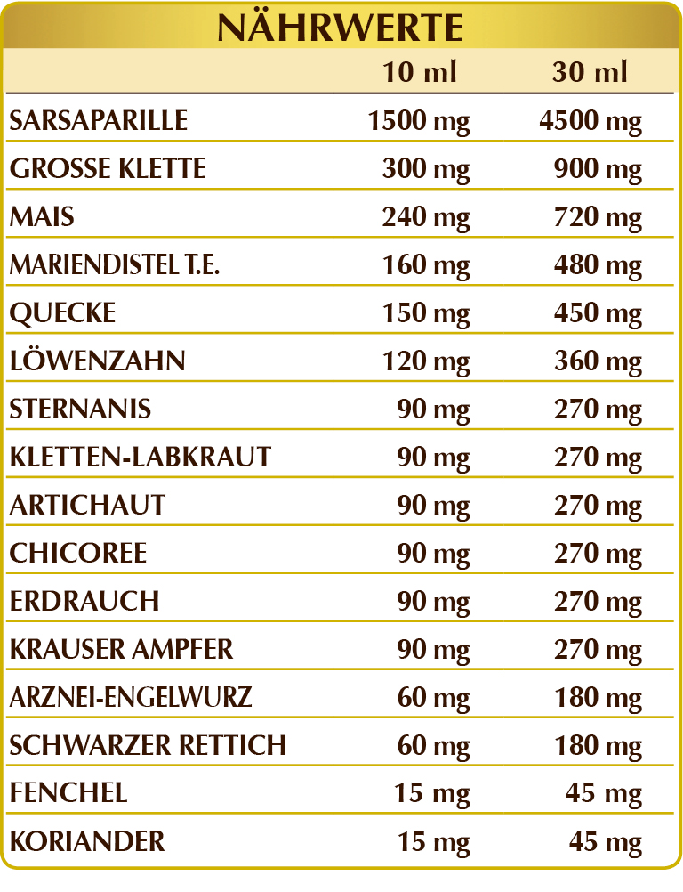 Pflanzliches Glycerin destilliert, reines Wasser, Sarsaparilla (Smilax medica) Wurzeln F.G.E., Klette (Arctium lappa) Kraut und frische Wurzeln F.G.E., Mais oder Zuckerkorn (Zea mays) Stigmata F.G.E., Milchdistel (Silybum Marianum) Früchte T.E. (standardisiert auf 40% Silymarin), Quecke (Agropyrum repens) Rhizome F.G.E., Löwenzahn (Taraxacum officinale) Wurzel F.G.E., Sternanis (Illicium verum) Früchte F.G.E., Kletten-Labkraut (Galium aparine) Kraut mit Blüten F.G.E., Artischocke (Cynara scolymus) Blätter F.G.E., Zichorie(Cichorium Intybus) Wurzeln F.G.E., Erdrauch (Fumaria officinalis) Kraut mit Blüten F.G.E., krauser Ampfer (Rumex crispus) Wurzel F.G.E., Arznei-Engelwurz (Angelica archangelica) Wurzel F.G.E., schwarzer Rettich (Raphanus sativus var. niger) Wurzeln F.G.E., Fenchel (Foeniculum vulgare) Früchte F.G.E., Koriander (Corian sativum) Früchte F.G.E., natürliche Süßstoffe Steviolglycoside und Thaumatin.