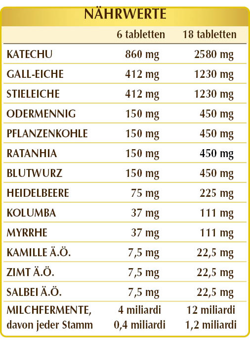 Catechu (Acacia catechu) Gummi Pulver, Gallnuss (Quercus infectoria) Gallen Pulver, Eiche (Quercus robur) Rinden Pulver, mikrokristalline Cellulose°, Arabisches Gummi°, Odermennig (Agrimonia eupatoria) Kraut Pulver, reaktive Pflanzenkohle (Carbo vegetabilis) aus Holz Pulver, Ratanhia (Krameria triandra) Wurzeln Pulver, Tormentill (Potentilla erecta) Rhizome Pulver, Heidelbeere (Vaccinium myrtillus) Früchte Pulver, Siliziumdioxid°°, Kolombo (Jateorhiza palmata) Wurzeln Pulver, Myrrhe (Commiphora myrrha) Gummiharz Pulver, Mischung aus Milchsäurebakterien (standardisiert auf 10% in jedem der folgenden Stämme: Bifidobacterium bifidum SD5215, breve SD5206, lactis SD5219; Lactobacillus acidophilus SD5212, brevis SD5214, bulgaricus SD5589, casei SD5213, paracasei SD5275, plantarum SD5209, rhamnosus SD5217), Römische Kamille (Anthemis nobilis) Blütenköpfe Ätherisches Öl, Zimt (Cinnamomum zeylanicum) Rinde Ätherisches Öl, Salbei (Salvia officinalis) Blätter Ätherisches Öl, Magnesiumstearat pflanzlichen Ursprungs°°. Pulv. = Pulver °Füllstoff °°Trennmittel