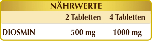 Diosmin aus Zitrusfrüchten, Maltodextrine aus Mais oder Reis, Gummi Arabicum°, mikrokristalline Cellulose°, Siliciumdioxid°°, Magnesiumstearat pflanzlichen Ursprungs°°.