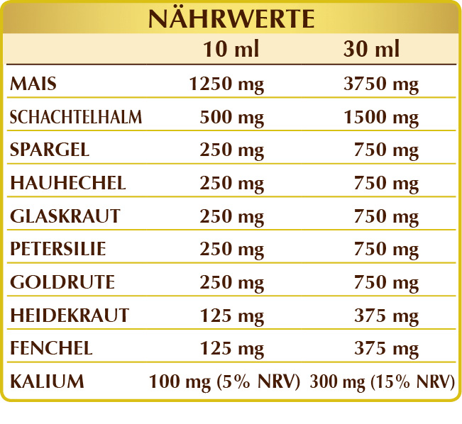 Bidestilliertes pflanzliches Glycerin, reines Wasser, Mais oder Zuckerkorn (Zea mays) Stigmata F.G.E., Schachtelhalm oder Pferdeschwanz (Equisetum arvense) Kraut F.G.E., Kaliumcitrat, Spargel (Asparagus officinalis) Wurzeln F.G.E., Hauhechel (Ononis spinosa) Wurzeln F.G.E., Glaskraut (Parietaria officinalis) Kraut F.G.E., Petersilie (Petroselinum crispum) Wurzeln F.G.E., Goldrute (Solidago virga-aurea) Kraut mit Blüten F.G.E., Heidekraut (Calluna vulgaris) Kraut mit Blüten F.G.E., Fenchel (Foeniculum vulgare) Früchte F.G.E.; Süßstoffe natürlicher Herkunft: Steviol-Glykoside und Thaumatin.