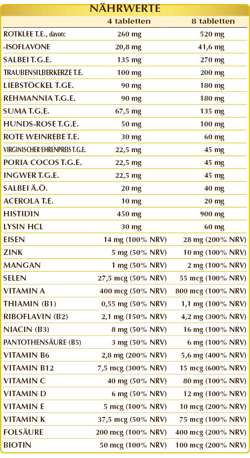 (L-)Histidin, Rotklee (Trifolium pratense) Blüten T.E. (titriert mit 8% Isoflavone), mikrokristalline Cellulose°, Gummi Arabicum°, Salbei (Salvia officinalis) Blätter T.G.E., Traubensilberkerze (Cimicifuga racemosa) Rhizome T.E. (titriert mit 2,5% Triterpenglykoside), Eisenammoniumcitrat, Liebstöckel oder Maggikraut (Levisticum officinale) Wurzeln T.G.E., Rehmannia (Rehmannia glutinosa) Wurzeln T.G.E., Suma oder Brasilianischer Ginseng (Pfaffia paniculata) Wurzeln T.G.E., Siliciumdioxid°°, Sojabohne (Glycine max) Samen T.E. (titriert mit 70% Vitamin C), Zinkgluconat, (L-)Lysin HCL oder Hydrochlorid, rote Weinrebe (Vitis vinifera) Samen T.E. (titriert mit 95% oligomere Proanthocyanidine), Virginischer Ehrenpreis (Leptandra virginica) Rhizome G.T.E., Poria Cocos (Poria cocos) Sclerotium (Pilz) G.T.E., Ingwer (Zingiber officinalis) Rhizome G.T.E., Salbei (Salvia officinalis) Blätter Ä.Ö., Vitamin E natürlicher Herkunft (D-α-Tocopherylacetat), Acerola (Malpighia glabra) Früchte T.E. (titriert mit 50 % Vitamin C), Magnesiumstearat pflanzlichen Ursprungs°°, Manganesgluconat, Vitamin B3 (Nicotinamid), aktiviertes Vitamin B6 (Pyridoxal-5-phosphat), aktiviertes Vitamin B2 (Riboflavin-5-Phosphat-Natrium), Vitamin B5 (Calciumpantothenat), Vitamin A (Retinylacetat), Flechte (Cladonia rangiferina), Thallus T.E. (titriert mit Vitamin D3 Cholecalciferol 100.000 IE/g), Vitamin B1 (Thiaminhydrochlorid), aktivierte Folsäure (L-Methylfolat-Calcium), Natriumselenit, Biotin, Vitamin K1 (Phylloquinon), aktiviertes Vitamin B12 (5-Deoxyadenosylcobalamin, Methylcobalamin).
