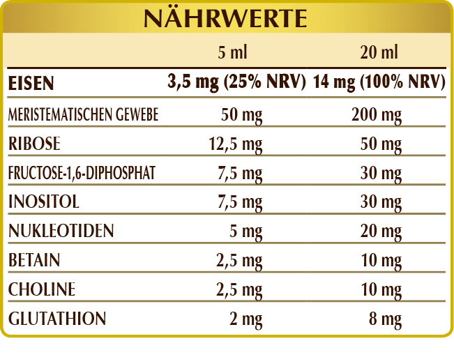 Bidestilliertes Pflanzliches Glycerin, reines Wasser; Frische Meristemgewebe (1%): Tamariske (Tamarix gallica) Knospen, Weißbuche (Carpinus betulus) Knospen, Himbeere (Rubus idaeus) junge Triebe, Hunds-Rose (Rosa canina) junge Triebe; Ribose, Fructose-1,6-Diphosphat; Acidität Korrektor: Citronensäure; Inositol, Betain Citrat, Cholin Tartrat; Nukleotid-Mischung: AMP (Adenosinmonophosphat), CMP (Cytosinmonophosphat), GMP (Guanosinmonophosphat), UMP (Uridinmonophosphat); Glutathion, Süßstoffe natürlicher Herkunft: Thaumatin. Mit natürlichen Süßungsmitteln.