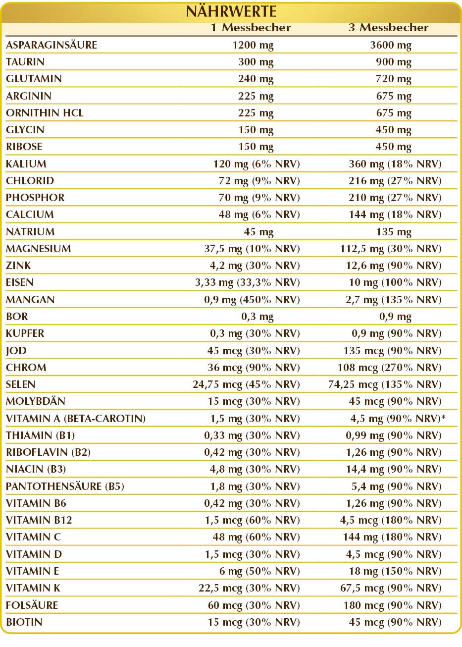 Maltodextrine aus Mais oder Reis, (L-)Asparaginsäure, Zitrone (Citrus limon) Früchte S.D., Taurin, Calcium-Glycerophosphat, (L-)Glutamin, Magnesium-Glycerophosphat, (L-)Arginin, (L-)Ornithin HCL oder Hydrochlorid, Natriumcitrat, Kaliumchlorid; Säureregulator: Zitronensäure; Glycin, Glukose (Dextrose), Ribose, Kaliumcitrat, basisches Magnesiumcitrat, Vitamin C (Ascorbinsäure), Ammonium-Eisen-Citrat, Zink-Gluconat, Beta-Carotin (standardisiert auf 10 %), Vitamin E (DL-α-Tocopherylacetat), Mangan-Gluconat; Süßungsmittel natürlichen Ursprungs: Steviolglykoside aus Stevia, Thaumatin; Vitamin B3 (Nicotinamid), Natriumborat, Vitamin B5 (Calciumpantothenat), Kupfersulfat, aktiviertes Vitamin B2 (Natrium-Riboflavin-5-phosphat), aktiviertes Vitamin B6 (Pyridoxal-5-phosphat), Vitamin D3 (Colecalciferol 100.000 IE/g), Vitamin B1 (Thiaminhydrochlorid), Chrompicolinat, aktivierte Folsäure (L-Methylfolat-Calcium), Kaliumiodid, Natriumselenit, Natriummolybdat, Vitamin K1 (Phyllochinon), Biotin, aktiviertes Vitamin B12 (5-Deoxyadenosylcobalamin, Methylcobalamin).