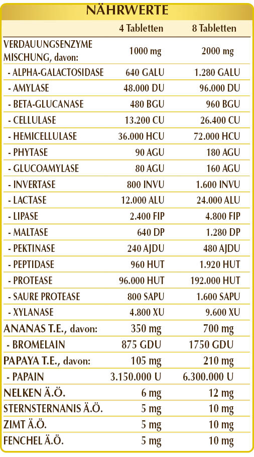 Nahrungsergänzungsmittel auf Basis pflanzlicher Verdauungsenzyme und ätherischer Öle. Die Extrakte aus Ananas und Papaya, zusammen mit den ätherischen Ölen von Nelke, Sternanis, Zimt und Fenchel, unterstützen die Verdauungsfunktion. Darüber hinaus tragen alle enthaltenen ätherischen Öle zur normalen gastrointestinalen Motilität bei und unterstützen die Gaselimination.