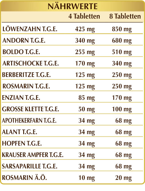 Löwenzahn, Boldo, Artischocke, Berberitze, Rosmarin und Enzian fördern die normale Leberfunktionalität. Andorn, Alant und Hopfen unterstützen die Verdauungsfunktion, während Krauser Ampfer, Sarsaparille und Große Klette bei den natürlichen Reinigungsfunktionalitäten des Körpers Mithilfe leisten.