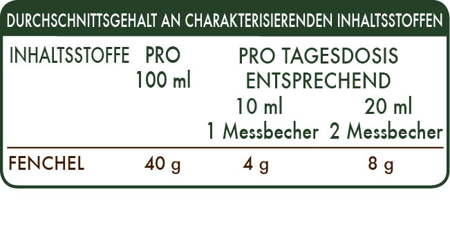 Alkoholfreie flüssig Gesamt-Extrakt, gewonnen aus: bidestilliertes pflanzliches Glycerin, reinem Wasser, Fenchel (Foeniculum vulgare) Früchte.