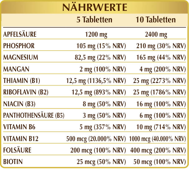 (L-)Äpfelsäure, Magnesiumglycerophosphat, mikrokristalline Cellulose°, Gummi arabicum°, Siliciumdioxid°°, aktiviertes Vitamin B2 (Natriumriboflavin-5-phosphat), Mangangluconat, Vitamin B1 (Thiaminhydrochlorid), Magnesiumstearat pflanzlichen Ursprungs°°, Vitamin B3 (Nicotinamid). ), aktiviertes Vitamin B6 (Pyridoxal-5-phosphat), Vitamin B5 (Calciumpantothenat), aktiviertes Vitamin B12 (5-Desoxyadenosylcobalamin, Methylcholbalamin), aktivierte Folsäure (Calcium-L-methylfolat), Biotin.