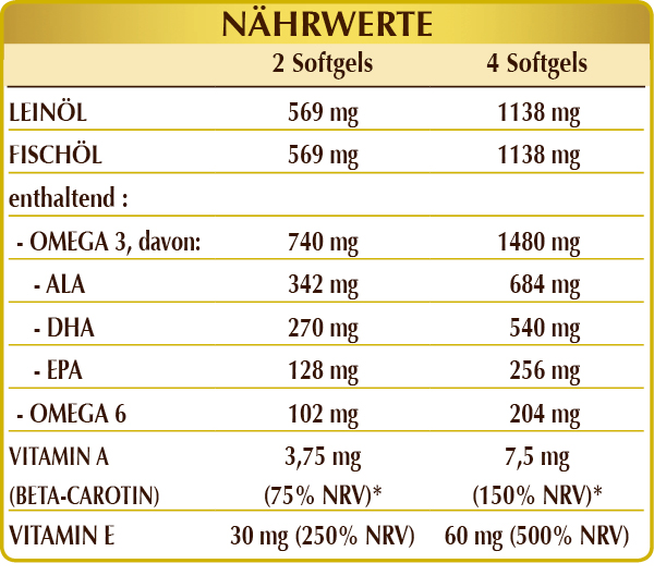 Lein (Linum usitatissimum) Pflanzenöl (standardisiert auf 50% ALA oder Linolα-säure), Fischöl (standardisiert auf 90% Gesamt-Omega 3, davon mindestens 75% DHA und 5% EPA), Fischölöl (standardisiert auf 70% Gesamt-Omega-3, davon mindestens 40% DHA und 20% EPA), Vitamin E natürlicher Herkunft (D-α-Tocopherol 900 UI); flüssiges Beta-Carotin (30 % in Maisöl); Hilfsstoffe (Softgel): Speisegelatine und Glycerin. Enthält Fischderivate.